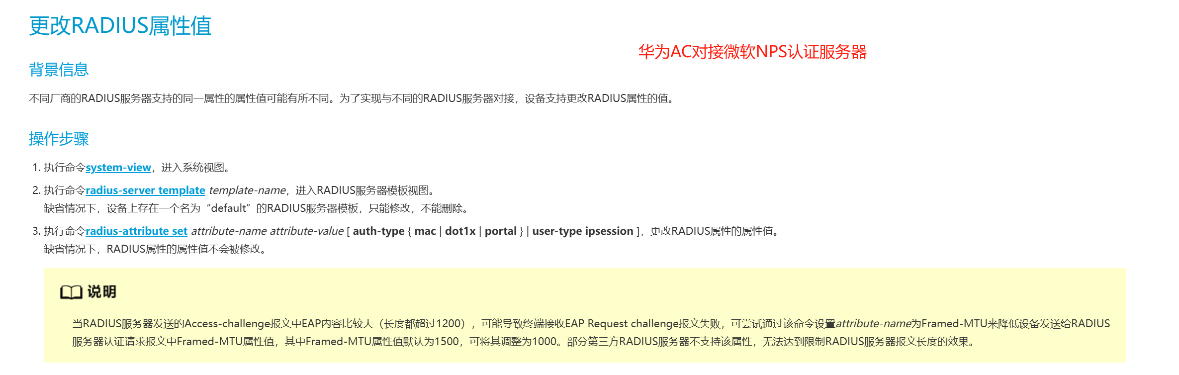 radius-attribute set Framed-MTU 1000 #此处调整MTU大小即可华为产品文档链接:https://support.huawei.com/hedex/hdx.do?docid=EDOC1100331917&id=ZH-CN_TASK_0176366387&ui=1
